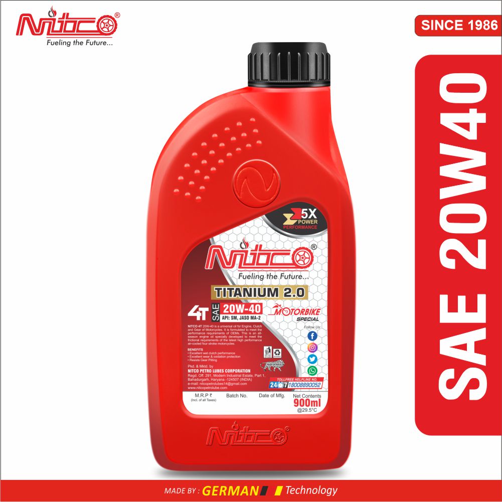 Nitco Titanium 2.0 Synth 4-T is a premium 4-stroke engine oil company (SAE 20W40) formulated with Protective Synthetic Chemistry for high-performance two-wheeler engine oil. It ensures strong lubrication, total engine protection against rust and corrosion, and reduced wear across a wide temperature range, ideal for new-generation air-cooled 4-stroke engine oil motorcycles. Nitco Lubricants a reliable bike engine oil manufacturer ensures high-quality two-wheeler engine oil for smooth performance and engine protection. Choosing a reputed engine oil company helps reduce friction, enhance fuel efficiency, and extend engine life. Whether for daily rides or long journeys, premium engine oil keeps your bike running efficiently and reliably.
